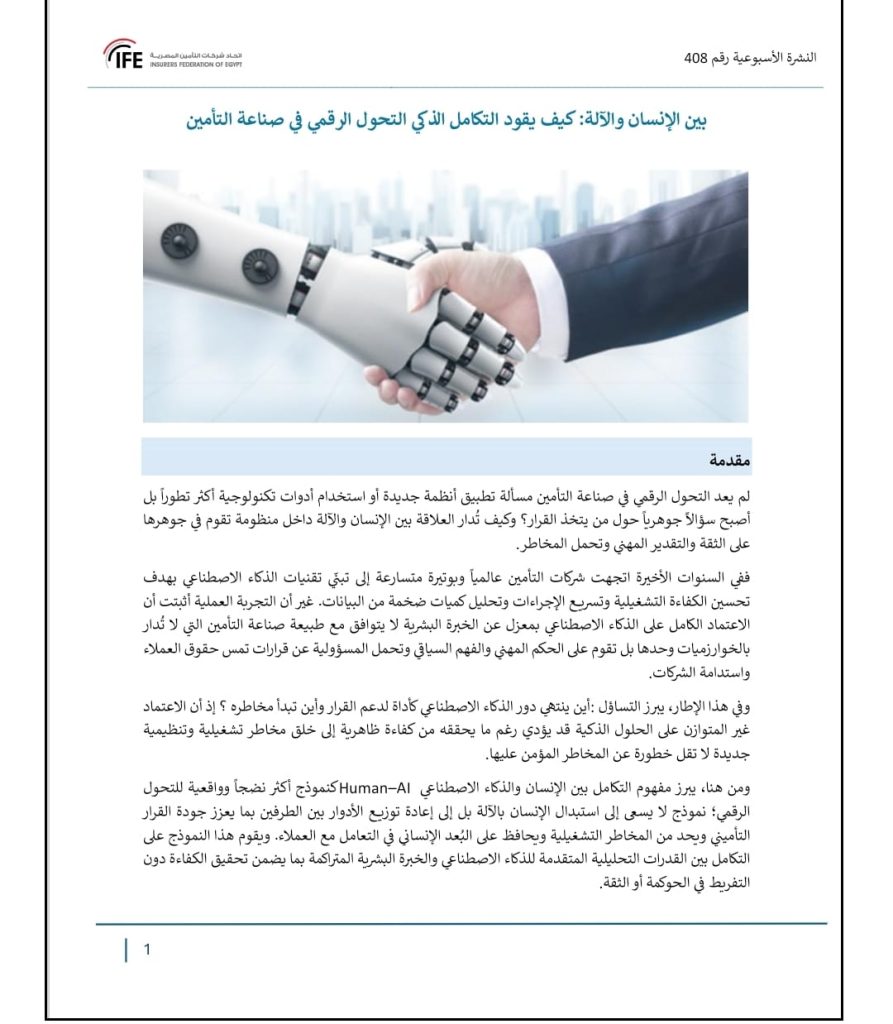 وأشار إلى أن مفهوم التكامل بين الإنسان والذكاء الاصطناعي Human–AI يبرز كنموذج أكثر نضجاً وواقعية للتحول الرقمي؛ نموذج لا يسعى إلى استبدال الإنسان بالآلة بل إلى إعادة توزيع الأدوار بين الطرفين بما يعزز جودة القرار التأميني ويحد من المخاطر التشغيلية ويحافظ على البُعد الإنساني في التعامل مع العملاء، كما يقوم هذا النموذج على التكامل بين القدرات التحليلية المتقدمة للذكاء الاصطناعي والخبرة البشرية المتراكمة بما يضمن تحقيق الكفاءة دون التفريط في الحوكمة أو الثقة.