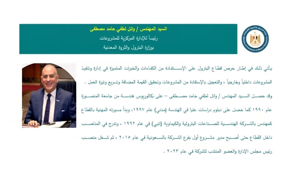 . المهندس / وائل لطفى حامد مصطفى – رئيساً للإدارة المركزية للمشروعات بوزارة البترول والثروة المعدنية .