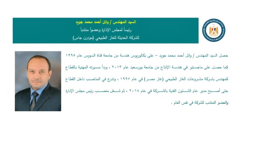 المهندس / وائل أحمد محمد جويد – رئيساً لمجلس الإدارة والعضو المنتدب للشركة الحديثة للغاز الطبيعي .