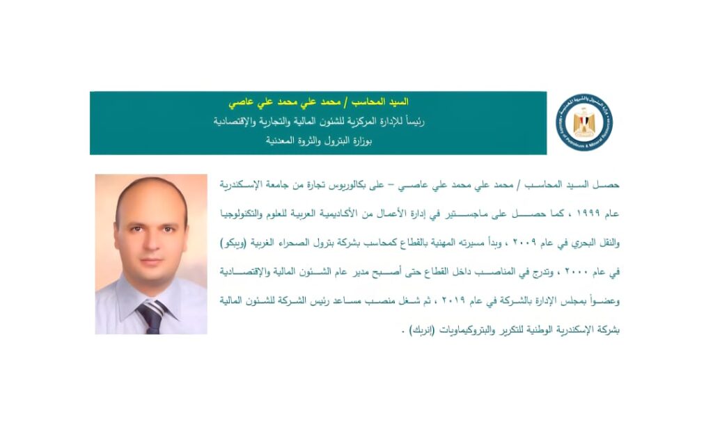 المحاسب / محمد علي محمد علي عاصي – رئيساً للإدارة المركزية للشئون المالية والتجارية والاقتصادية بوزارة البترول والثروة المعدنية .