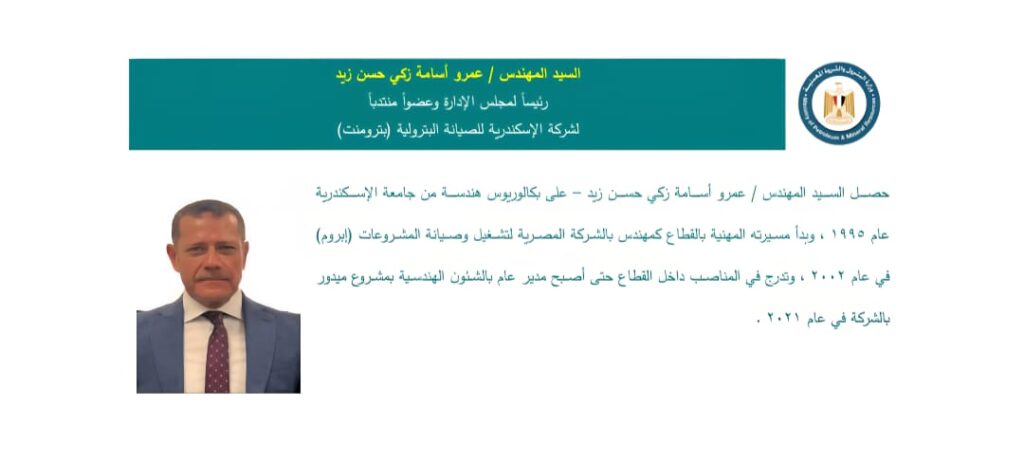 المهندس / عمرو أسامة زكي زيد – رئيساً لمجلس الإدارة والعضو المنتدب الشركة الإسكندرية للصيانة البترولية (بترومنت) .
