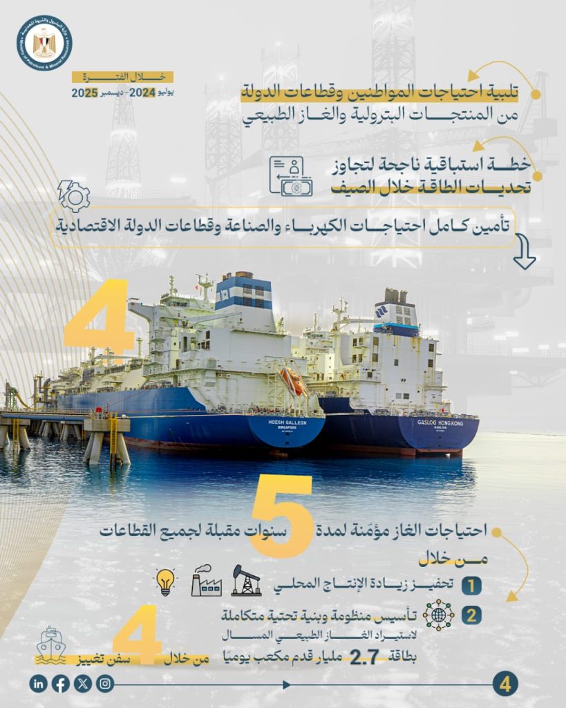 تنفيذ خطة استباقية ، بدعم من فخامة الرئيس عبدالفتاح السيسي ودولة رئيس مجلس الوزراء الدكتور مصطفى مدبولي ، لتجاوز تحديات الطاقة وتأمين الإمدادات اللازمة لمحطات الكهرباء خلال فصل الصيف ، وتوفير كامل احتياجات قطاع الصناعة وكافة قطاعات الدولة الاقتصادية من الغاز والتي أصبحت مؤمّنة لمدة خمس سنوات مقبلة ، فبالإضافة إلى جهود زيادة الإنتاج المحلى فقد تم تأسيس منظومة وبنية تحتية متكاملة لاستيراد الغاز الطبيعي المسال عبر سفن التغييز، بطاقة تصل إلى 2.7 مليار قدم مكعب يومياً، وبجهود أكثر من 1500 زميل وزميلة من قطاع البترول.