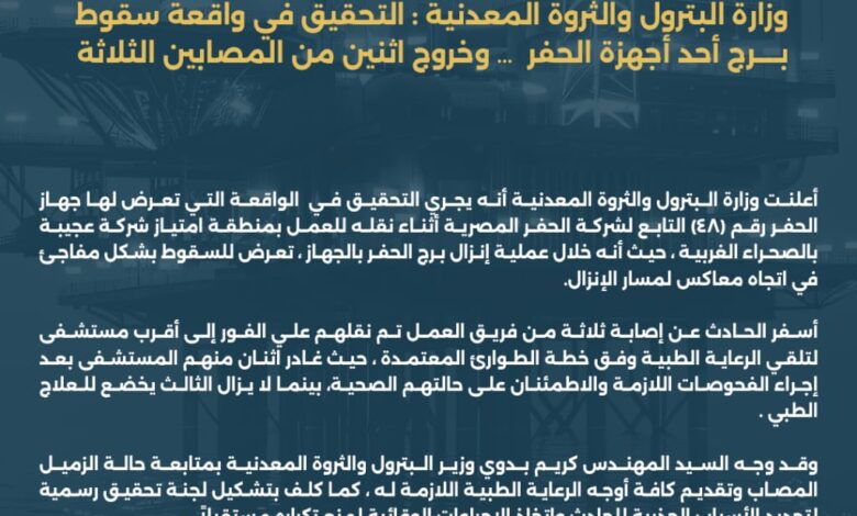 وزارة البترول والثروة المعدنية :التحقيق في واقعة سقوط برج أحد أجهزة الحفر … وخروج اثنين من المصابين الثلاثة