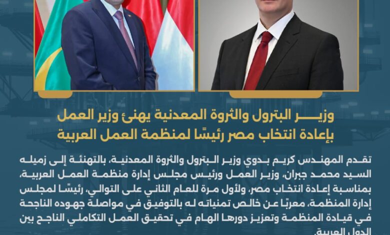 تقدم المهندس كريم بدوي وزير البترول والثروة المعدنية، بالتهنئة إلى زميله السيد محمد جبران، وزير العمل ورئيس مجلس إدارة منظمة العمل العربية، بمناسبة إعادة انتخاب مصر، ولأول مرة للعام الثاني على التوالي، رئيسًا لمجلس إدارة المنظمة، معربًا عن خالص تمنياته له بالتوفيق في مواصلة جهوده الناجحة في قيادة المنظمة وتعزيز دورها الهام في تحقيق العمل التكاملي الناجح بين الدول العربية.